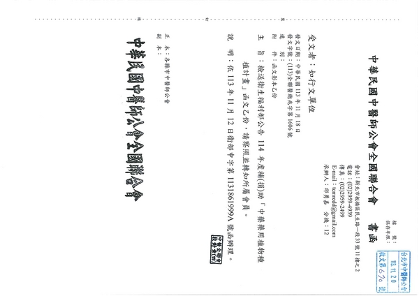 | 台北市中醫師公會 官網:http://www.tpcma.org.tw 地址:台北市中正區青島西路11號3樓 E-mail:tp.cma@msa.hinet.net 電話:(02)2314-3456(代表號) 傳真:(02)2314-8181 |