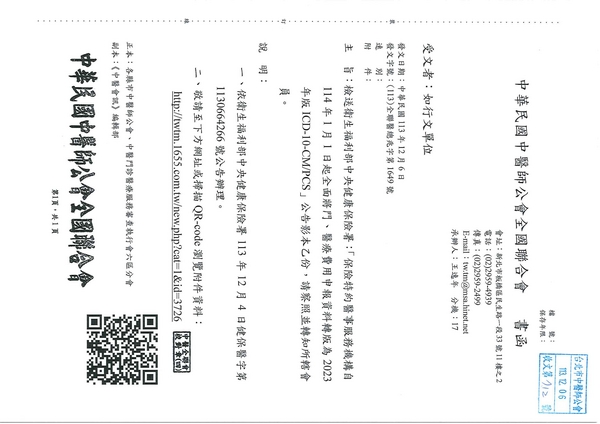 | 台北市中醫師公會 官網:http://www.tpcma.org.tw 地址:台北市中正區青島西路11號3樓 E-mail:tp.cma@msa.hinet.net 電話:(02)2314-3456(代表號) 傳真:(02)2314-8181 |