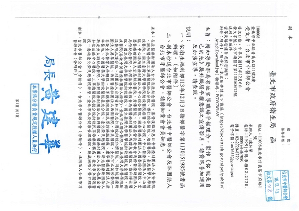 | 台北市中醫師公會 官網:http://www.tpcma.org.tw 地址:台北市中正區青島西路11號3樓 E-mail:tp.cma@msa.hinet.net 電話:(02)2314-3456(代表號) 傳真:(02)2314-8181 |