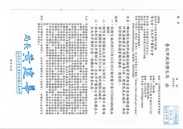 | 台北市中醫師公會 官網:http://www.tpcma.org.tw 地址:台北市中正區青島西路11號3樓 E-mail:tp.cma@msa.hinet.net 電話:(02)2314-3456(代表號) 傳真:(02)2314-8181 |