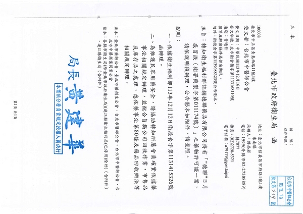| 台北市中醫師公會 官網:http://www.tpcma.org.tw 地址:台北市中正區青島西路11號3樓 E-mail:tp.cma@msa.hinet.net 電話:(02)2314-3456(代表號) 傳真:(02)2314-8181 |