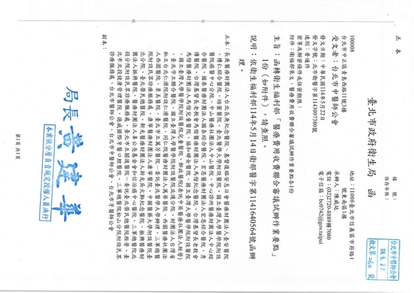 | 台北市中醫師公會 官網:http://www.tpcma.org.tw 地址:台北市中正區青島西路11號3樓 E-mail:tp.cma@msa.hinet.net 電話:(02)2314-3456(代表號) 傳真:(02)2314-8181 |