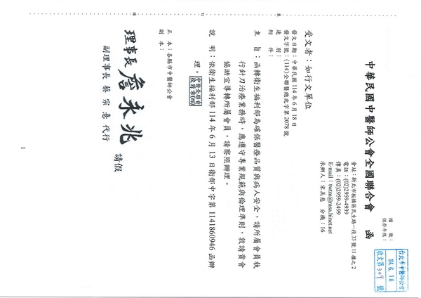 | 台北市中醫師公會 官網:http://www.tpcma.org.tw 地址:台北市中正區青島西路11號3樓 E-mail:tp.cma@msa.hinet.net 電話:(02)2314-3456(代表號) 傳真:(02)2314-8181 |