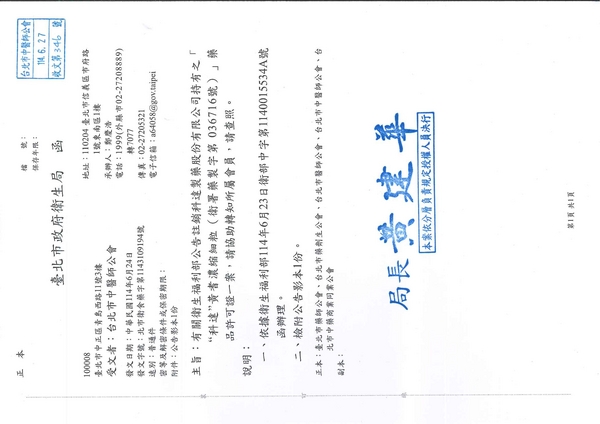 | 台北市中醫師公會 官網:http://www.tpcma.org.tw 地址:台北市中正區青島西路11號3樓 E-mail:tp.cma@msa.hinet.net 電話:(02)2314-3456(代表號) 傳真:(02)2314-8181 |