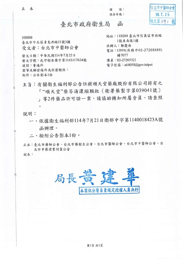 | 台北市中醫師公會 官網:http://www.tpcma.org.tw 地址:台北市中正區青島西路11號3樓 E-mail:tp.cma@msa.hinet.net 電話:(02)2314-3456(代表號) 傳真:(02)2314-8181 |