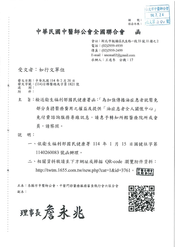 | 台北市中醫師公會 官網:http://www.tpcma.org.tw 地址:台北市中正區青島西路11號3樓 E-mail:tp.cma@msa.hinet.net 電話:(02)2314-3456(代表號) 傳真:(02)2314-8181 |
