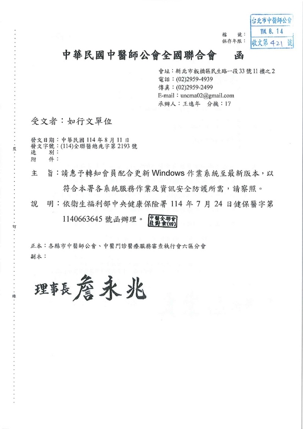 | 台北市中醫師公會 官網:http://www.tpcma.org.tw 地址:台北市中正區青島西路11號3樓 E-mail:tp.cma@msa.hinet.net 電話:(02)2314-3456(代表號) 傳真:(02)2314-8181 |