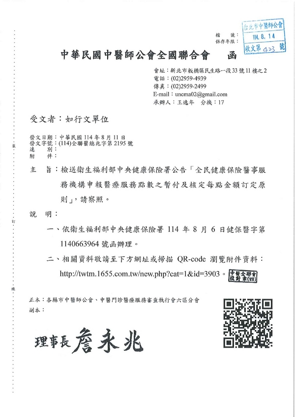 | 台北市中醫師公會 官網:http://www.tpcma.org.tw 地址:台北市中正區青島西路11號3樓 E-mail:tp.cma@msa.hinet.net 電話:(02)2314-3456(代表號) 傳真:(02)2314-8181 |