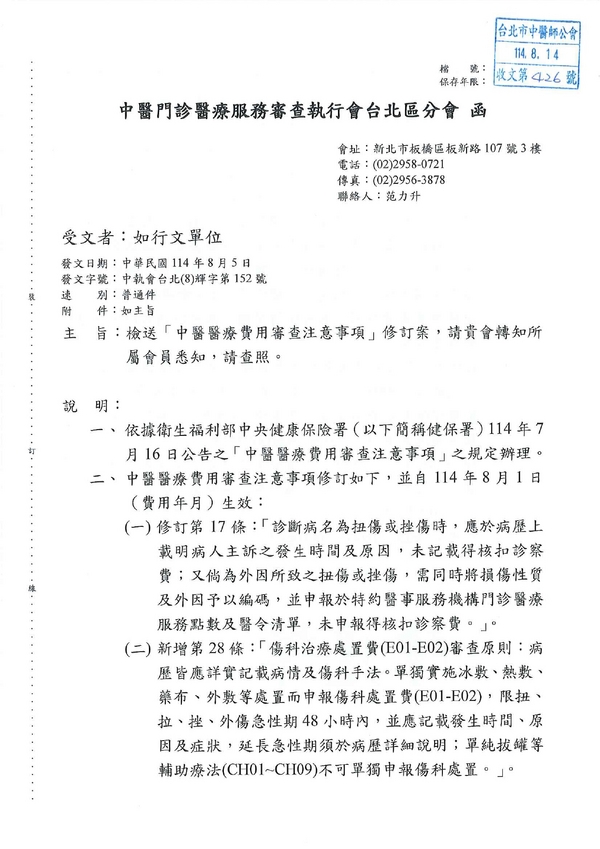 | 台北市中醫師公會 官網:http://www.tpcma.org.tw 地址:台北市中正區青島西路11號3樓 E-mail:tp.cma@msa.hinet.net 電話:(02)2314-3456(代表號) 傳真:(02)2314-8181 |