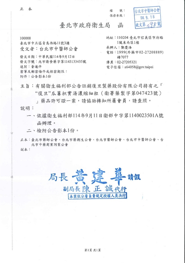 | 台北市中醫師公會 官網:http://www.tpcma.org.tw 地址:台北市中正區青島西路11號3樓 E-mail:tp.cma@msa.hinet.net 電話:(02)2314-3456(代表號) 傳真:(02)2314-8181 |
