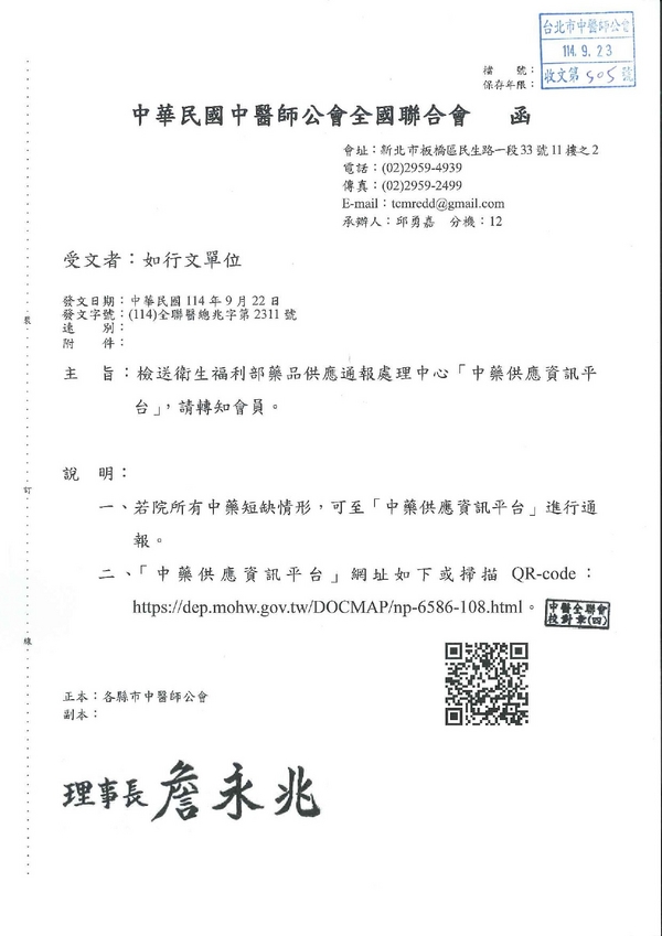| 台北市中醫師公會 官網:http://www.tpcma.org.tw 地址:台北市中正區青島西路11號3樓 E-mail:tp.cma@msa.hinet.net 電話:(02)2314-3456(代表號) 傳真:(02)2314-8181 |
