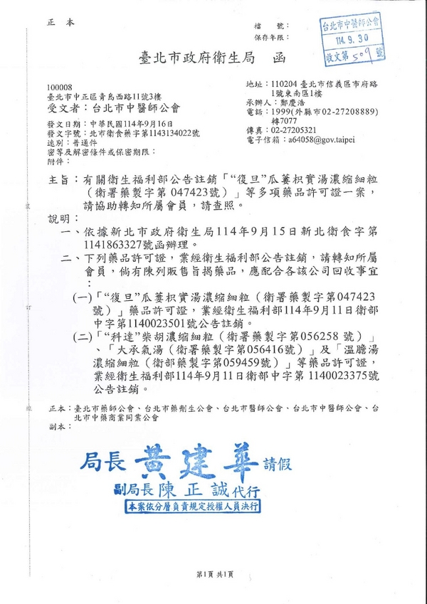 | 台北市中醫師公會 官網:http://www.tpcma.org.tw 地址:台北市中正區青島西路11號3樓 E-mail:tp.cma@msa.hinet.net 電話:(02)2314-3456(代表號) 傳真:(02)2314-8181 |