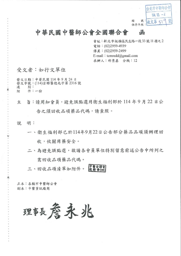 | 台北市中醫師公會 官網:http://www.tpcma.org.tw 地址:台北市中正區青島西路11號3樓 E-mail:tp.cma@msa.hinet.net 電話:(02)2314-3456(代表號) 傳真:(02)2314-8181 |