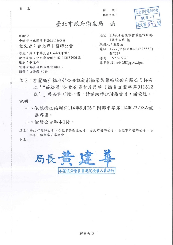 | 台北市中醫師公會 官網:http://www.tpcma.org.tw 地址:台北市中正區青島西路11號3樓 E-mail:tp.cma@msa.hinet.net 電話:(02)2314-3456(代表號) 傳真:(02)2314-8181 |