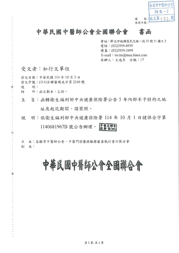| 台北市中醫師公會 官網:http://www.tpcma.org.tw 地址:台北市中正區青島西路11號3樓 E-mail:tp.cma@msa.hinet.net 電話:(02)2314-3456(代表號) 傳真:(02)2314-8181 |