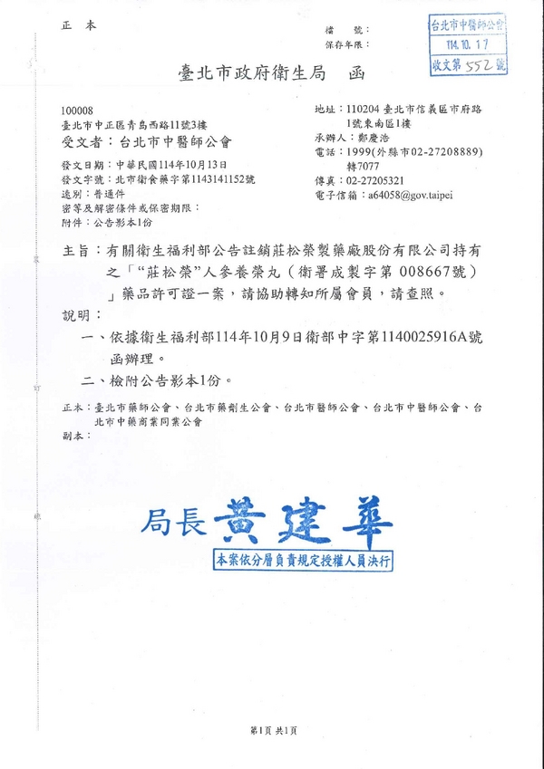 | 台北市中醫師公會 官網:http://www.tpcma.org.tw 地址:台北市中正區青島西路11號3樓 E-mail:tp.cma@msa.hinet.net 電話:(02)2314-3456(代表號) 傳真:(02)2314-8181 |