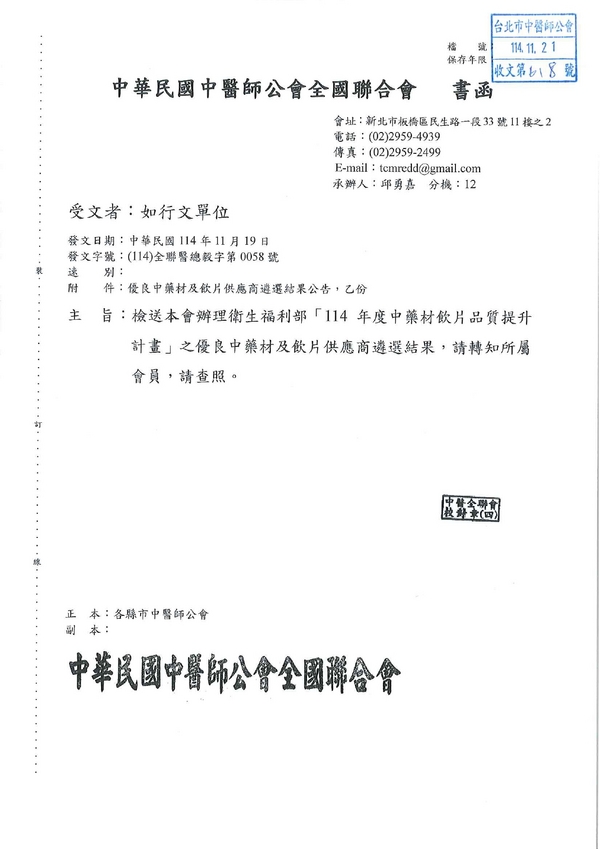 | 台北市中醫師公會 官網:http://www.tpcma.org.tw 地址:台北市中正區青島西路11號3樓 E-mail:tp.cma@msa.hinet.net 電話:(02)2314-3456(代表號) 傳真:(02)2314-8181 |