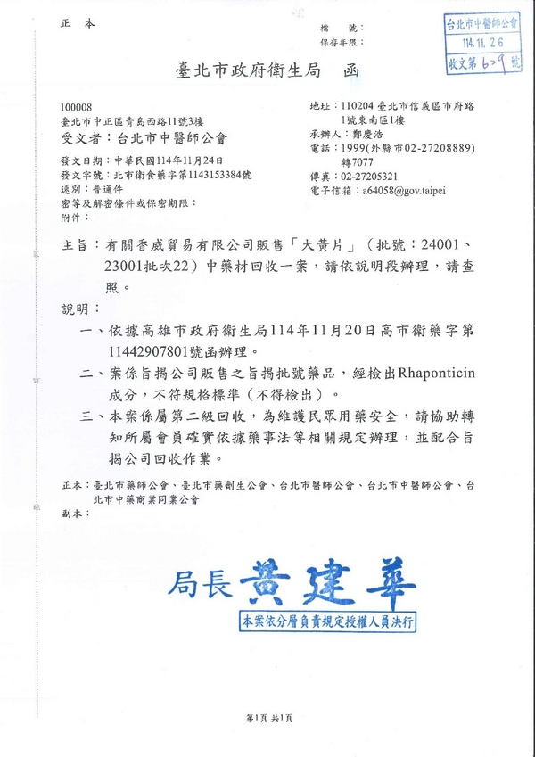 | 台北市中醫師公會 官網:http://www.tpcma.org.tw 地址:台北市中正區青島西路11號3樓 E-mail:tp.cma@msa.hinet.net 電話:(02)2314-3456(代表號) 傳真:(02)2314-8181 |