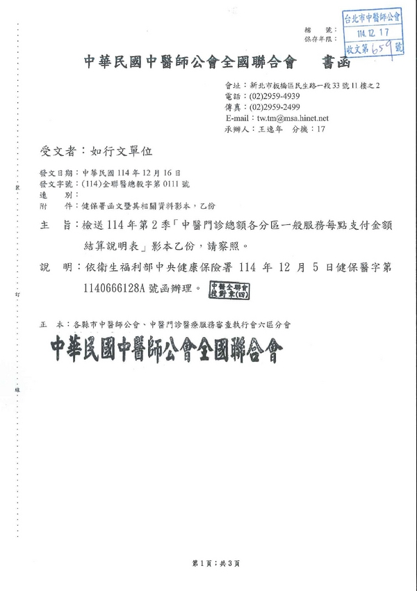 | 台北市中醫師公會 官網:http://www.tpcma.org.tw 地址:台北市中正區青島西路11號3樓 E-mail:tp.cma@msa.hinet.net 電話:(02)2314-3456(代表號) 傳真:(02)2314-8181 |