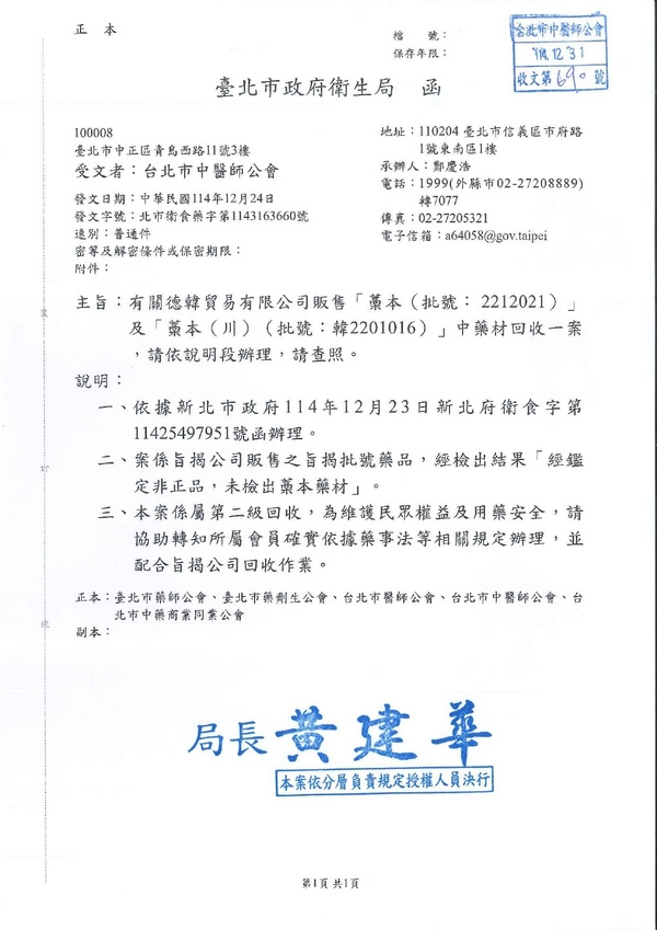 | 台北市中醫師公會 官網:http://www.tpcma.org.tw 地址:台北市中正區青島西路11號3樓 E-mail:tp.cma@msa.hinet.net 電話:(02)2314-3456(代表號) 傳真:(02)2314-8181 |
