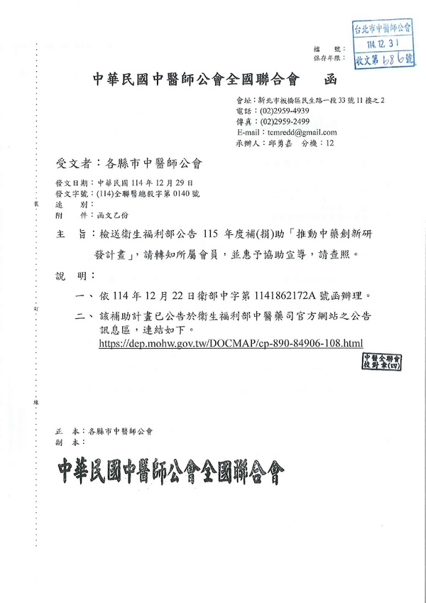 | 台北市中醫師公會 官網:http://www.tpcma.org.tw 地址:台北市中正區青島西路11號3樓 E-mail:tp.cma@msa.hinet.net 電話:(02)2314-3456(代表號) 傳真:(02)2314-8181 |