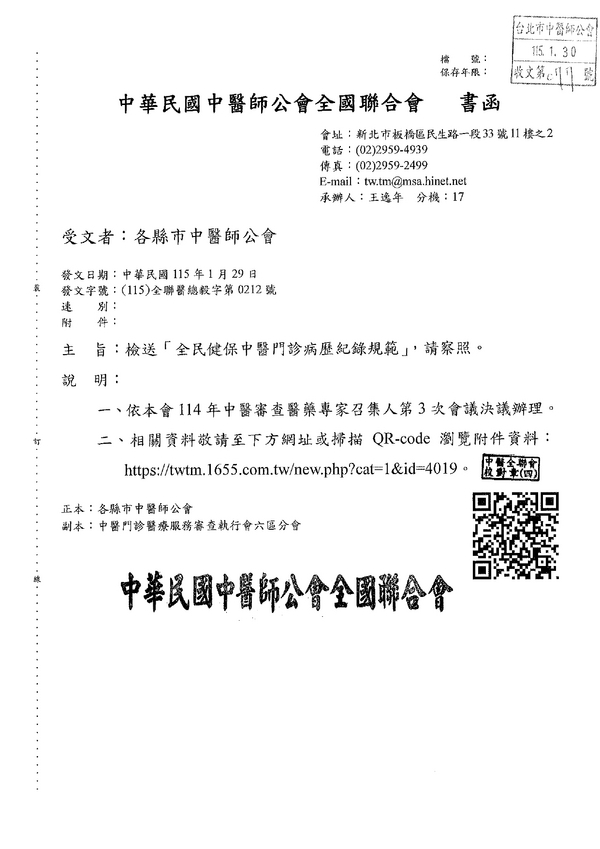 | 台北市中醫師公會 官網:http://www.tpcma.org.tw 地址:台北市中正區青島西路11號3樓 E-mail:tp.cma@msa.hinet.net 電話:(02)2314-3456(代表號) 傳真:(02)2314-8181 |
