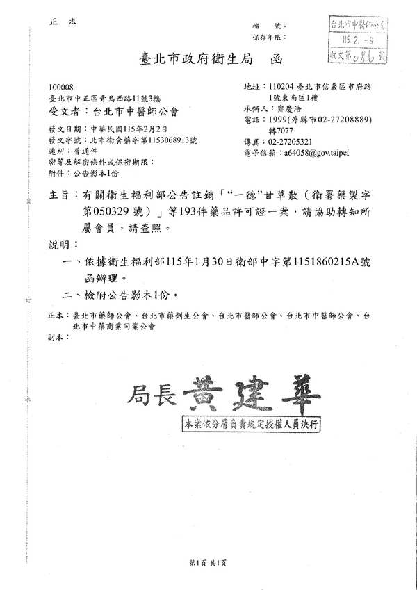 | 台北市中醫師公會 官網:http://www.tpcma.org.tw 地址:台北市中正區青島西路11號3樓 E-mail:tp.cma@msa.hinet.net 電話:(02)2314-3456(代表號) 傳真:(02)2314-8181 |