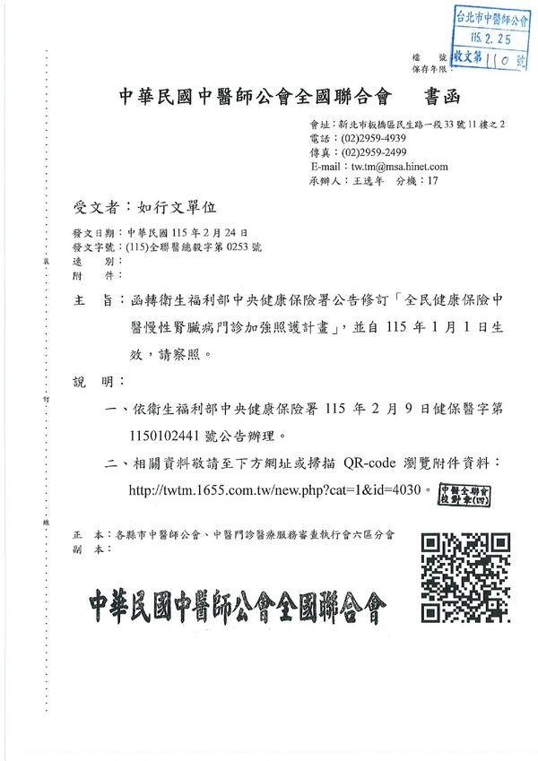 | 台北市中醫師公會 官網:http://www.tpcma.org.tw 地址:台北市中正區青島西路11號3樓 E-mail:tp.cma@msa.hinet.net 電話:(02)2314-3456(代表號) 傳真:(02)2314-8181 |
