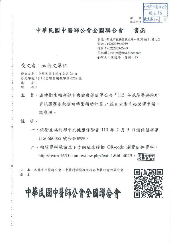 | 台北市中醫師公會 官網:http://www.tpcma.org.tw 地址:台北市中正區青島西路11號3樓 E-mail:tp.cma@msa.hinet.net 電話:(02)2314-3456(代表號) 傳真:(02)2314-8181 |