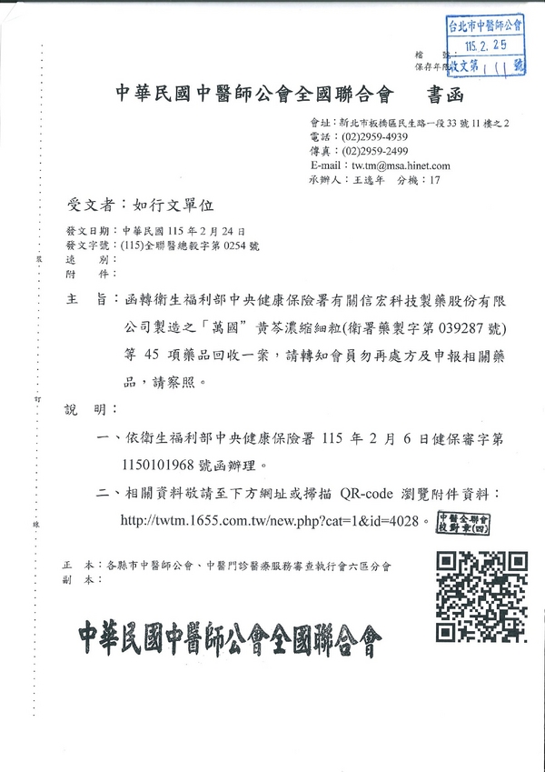 | 台北市中醫師公會 官網:http://www.tpcma.org.tw 地址:台北市中正區青島西路11號3樓 E-mail:tp.cma@msa.hinet.net 電話:(02)2314-3456(代表號) 傳真:(02)2314-8181 |