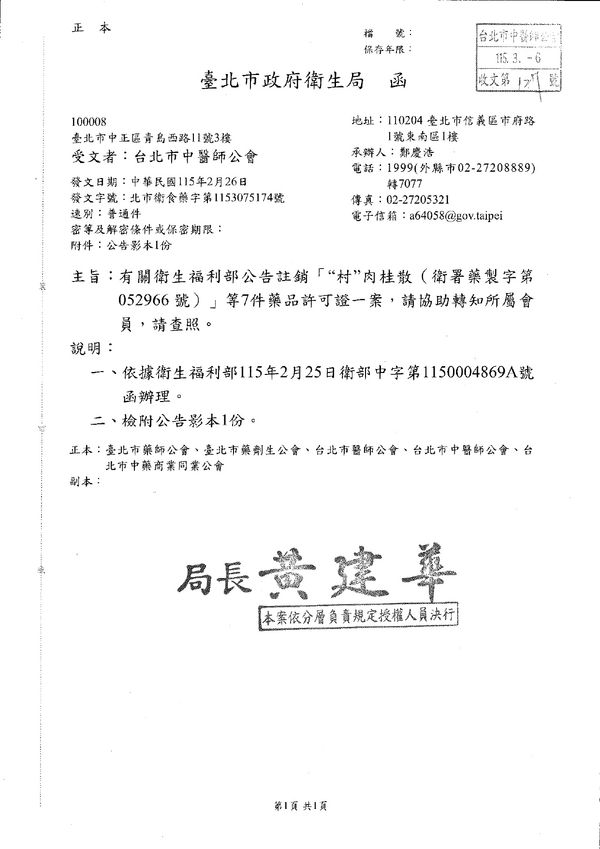 | 台北市中醫師公會 官網:http://www.tpcma.org.tw 地址:台北市中正區青島西路11號3樓 E-mail:tp.cma@msa.hinet.net 電話:(02)2314-3456(代表號) 傳真:(02)2314-8181 |