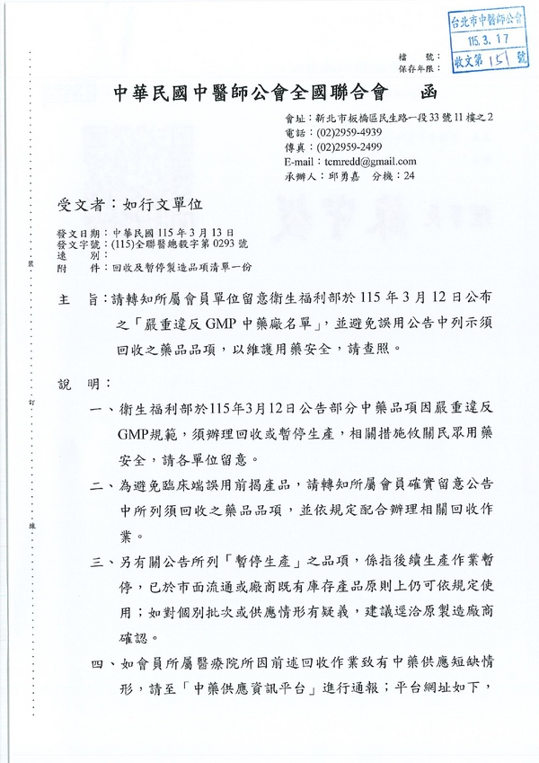 | 台北市中醫師公會 官網:http://www.tpcma.org.tw 地址:台北市中正區青島西路11號3樓 E-mail:tp.cma@msa.hinet.net 電話:(02)2314-3456(代表號) 傳真:(02)2314-8181 |