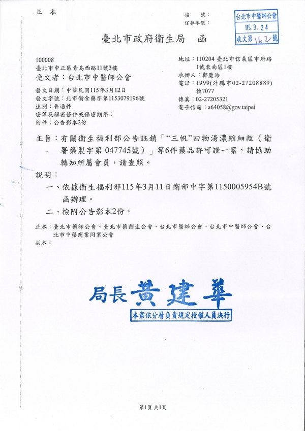 | 台北市中醫師公會 官網:http://www.tpcma.org.tw 地址:台北市中正區青島西路11號3樓 E-mail:tp.cma@msa.hinet.net 電話:(02)2314-3456(代表號) 傳真:(02)2314-8181 |