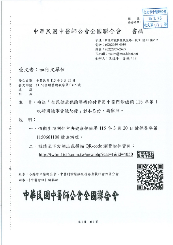 | 台北市中醫師公會 官網:http://www.tpcma.org.tw 地址:台北市中正區青島西路11號3樓 E-mail:tp.cma@msa.hinet.net 電話:(02)2314-3456(代表號) 傳真:(02)2314-8181 |