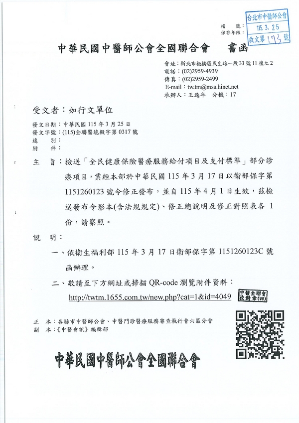 | 台北市中醫師公會 官網:http://www.tpcma.org.tw 地址:台北市中正區青島西路11號3樓 E-mail:tp.cma@msa.hinet.net 電話:(02)2314-3456(代表號) 傳真:(02)2314-8181 |