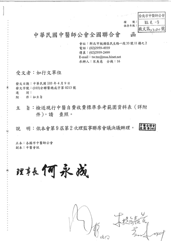 | 台北市中醫師公會 官網:http://www.tpcma.org.tw 地址:台北市中正區青島西路11號3樓 E-mail:tp.cma@msa.hinet.net 電話:(02)2314-3456(代表號) 傳真:(02)2314-8181 |