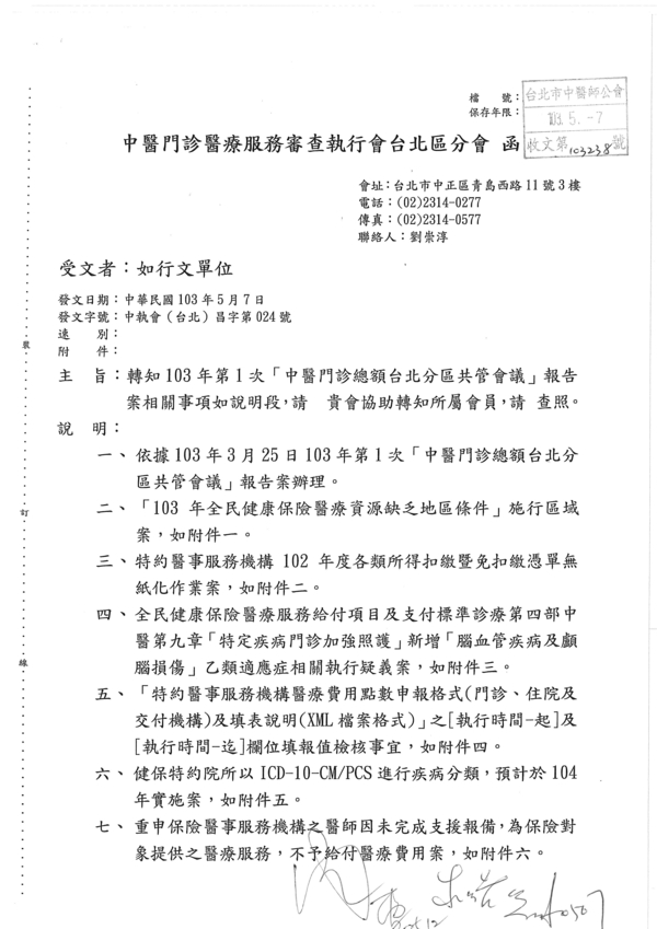 | 台北市中醫師公會 官網:http://www.tpcma.org.tw 地址:台北市中正區青島西路11號3樓 E-mail:tp.cma@msa.hinet.net 電話:(02)2314-3456(代表號) 傳真:(02)2314-8181 |