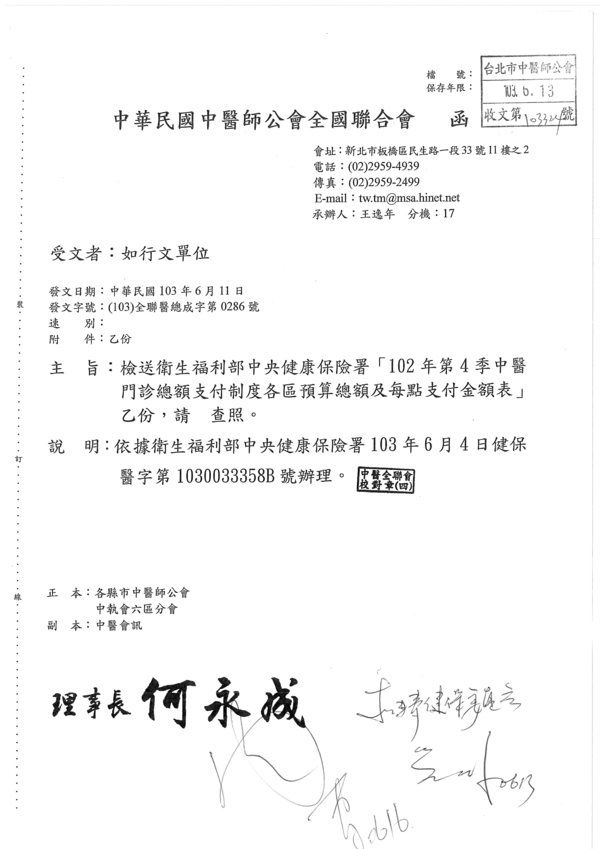 | 台北市中醫師公會 官網:http://www.tpcma.org.tw 地址:台北市中正區青島西路11號3樓 E-mail:tp.cma@msa.hinet.net 電話:(02)2314-3456(代表號) 傳真:(02)2314-8181 |