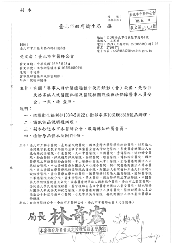 | 台北市中醫師公會 官網:http://www.tpcma.org.tw 地址:台北市中正區青島西路11號3樓 E-mail:tp.cma@msa.hinet.net 電話:(02)2314-3456(代表號) 傳真:(02)2314-8181 |