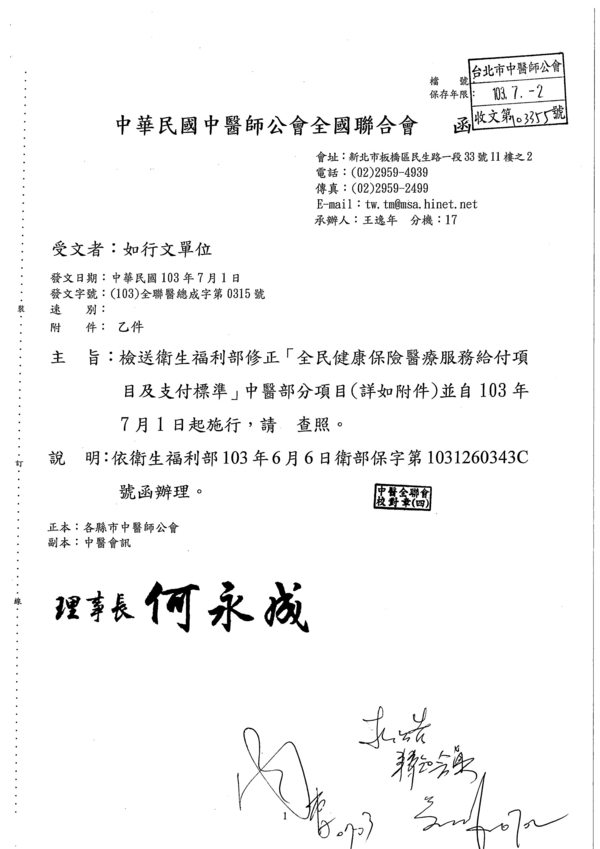| 台北市中醫師公會 官網:http://www.tpcma.org.tw 地址:台北市中正區青島西路11號3樓 E-mail:tp.cma@msa.hinet.net 電話:(02)2314-3456(代表號) 傳真:(02)2314-8181 |