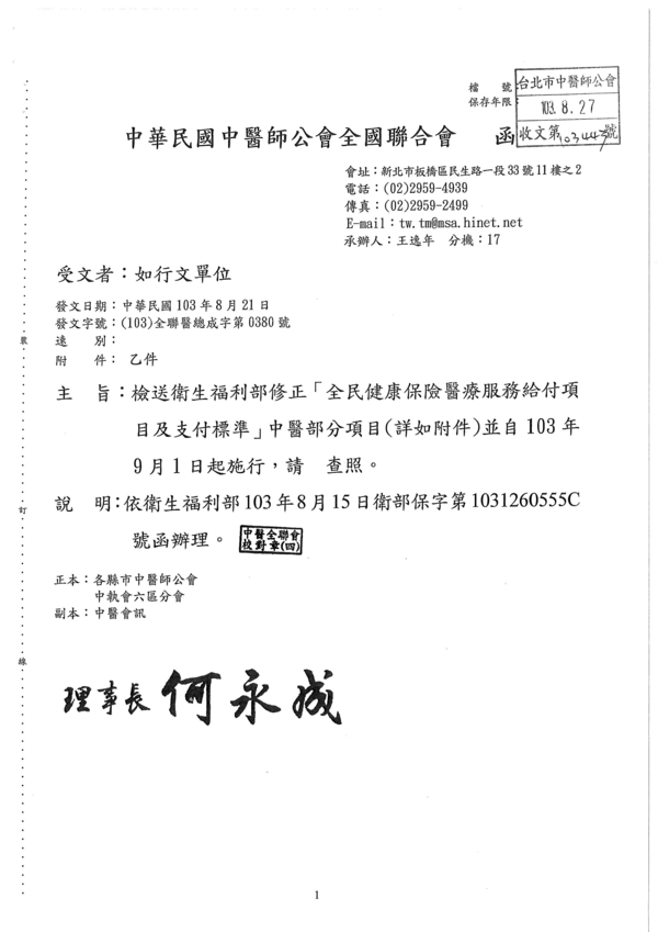 | 台北市中醫師公會 官網:http://www.tpcma.org.tw 地址:台北市中正區青島西路11號3樓 E-mail:tp.cma@msa.hinet.net 電話:(02)2314-3456(代表號) 傳真:(02)2314-8181 |
