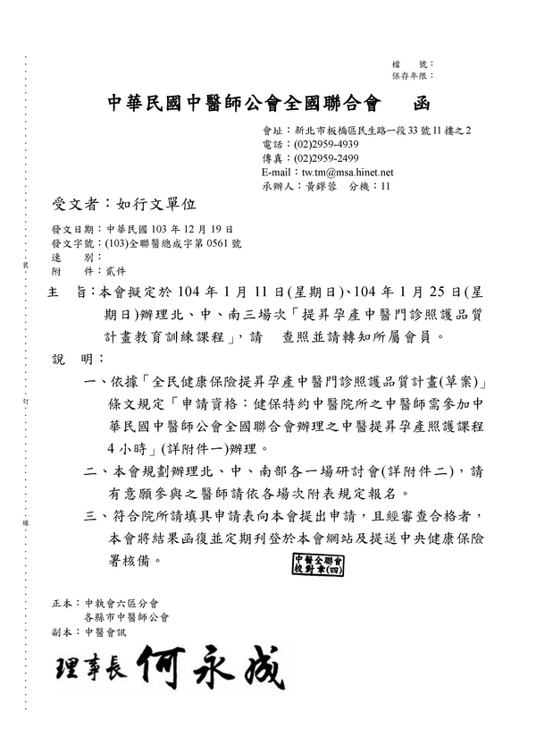 | 台北市中醫師公會 官網:http://www.tpcma.org.tw 地址:台北市中正區青島西路11號3樓 E-mail:tp.cma@msa.hinet.net 電話:(02)2314-3456(代表號) 傳真:(02)2314-8181 |