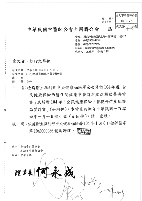 | 台北市中醫師公會 官網:http://www.tpcma.org.tw 地址:台北市中正區青島西路11號3樓 E-mail:tp.cma@msa.hinet.net 電話:(02)2314-3456(代表號) 傳真:(02)2314-8181 |