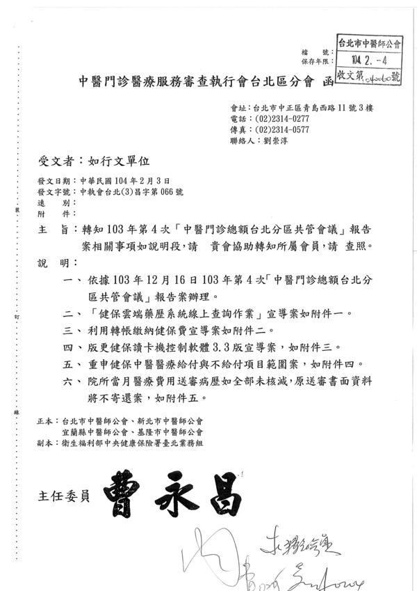 | 台北市中醫師公會 官網:http://www.tpcma.org.tw 地址:台北市中正區青島西路11號3樓 E-mail:tp.cma@msa.hinet.net 電話:(02)2314-3456(代表號) 傳真:(02)2314-8181 |