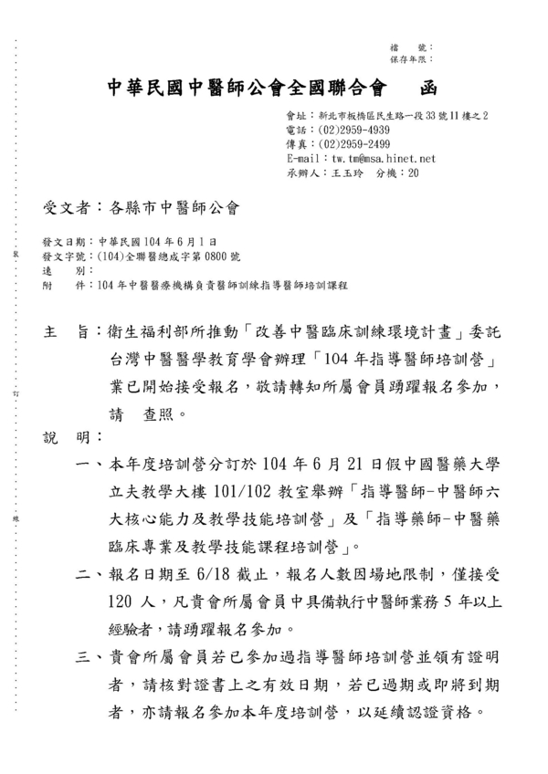 | 台北市中醫師公會 官網:http://www.tpcma.org.tw 地址:台北市中正區青島西路11號3樓 E-mail:tp.cma@msa.hinet.net 電話:(02)2314-3456(代表號) 傳真:(02)2314-8181 |