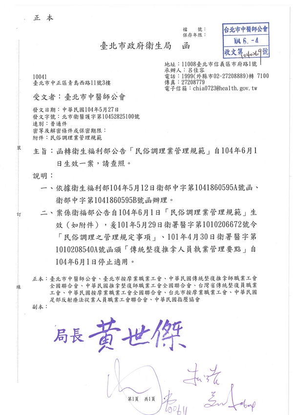| 台北市中醫師公會 官網:http://www.tpcma.org.tw 地址:台北市中正區青島西路11號3樓 E-mail:tp.cma@msa.hinet.net 電話:(02)2314-3456(代表號) 傳真:(02)2314-8181 |