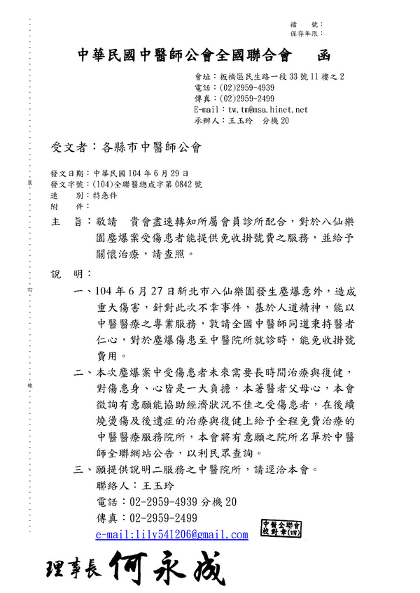 | 台北市中醫師公會 官網:http://www.tpcma.org.tw 地址:台北市中正區青島西路11號3樓 E-mail:tp.cma@msa.hinet.net 電話:(02)2314-3456(代表號) 傳真:(02)2314-8181 |
