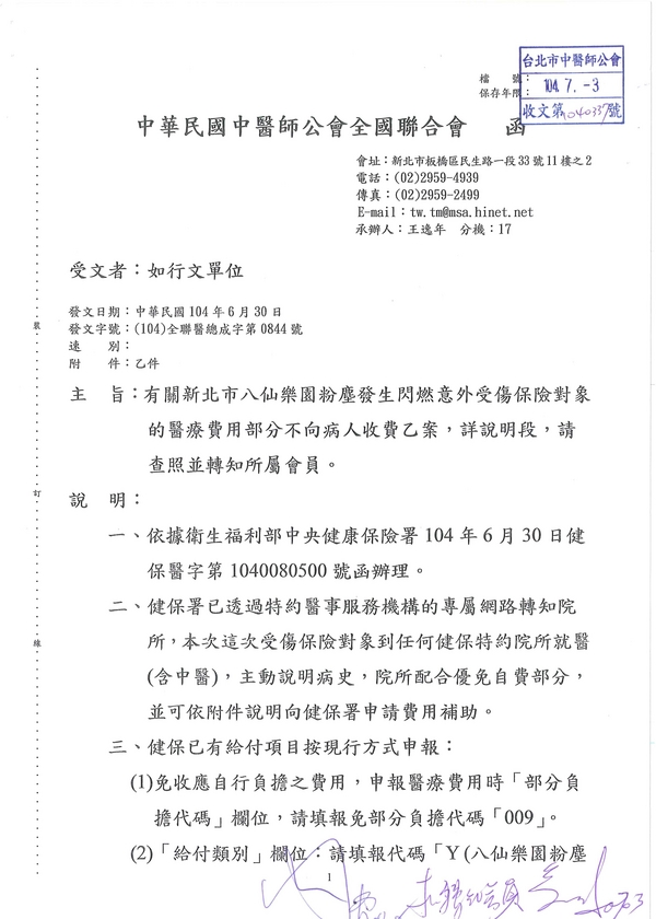 | 台北市中醫師公會 官網:http://www.tpcma.org.tw 地址:台北市中正區青島西路11號3樓 E-mail:tp.cma@msa.hinet.net 電話:(02)2314-3456(代表號) 傳真:(02)2314-8181 |