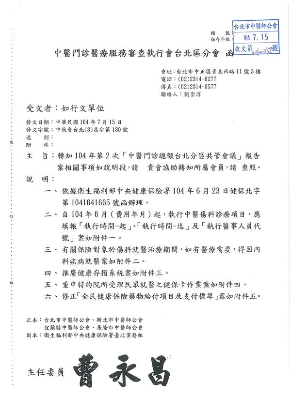 | 台北市中醫師公會 官網:http://www.tpcma.org.tw 地址:台北市中正區青島西路11號3樓 E-mail:tp.cma@msa.hinet.net 電話:(02)2314-3456(代表號) 傳真:(02)2314-8181 |