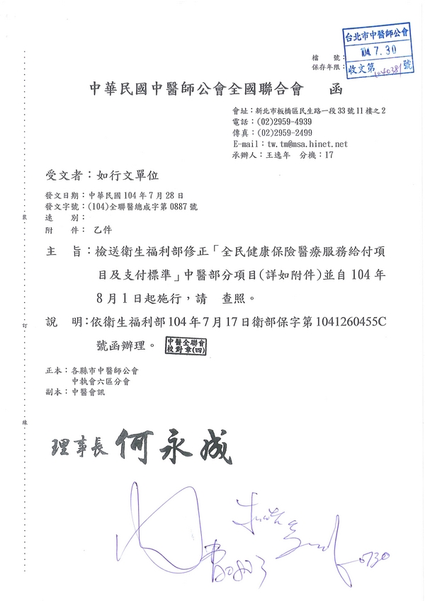 | 台北市中醫師公會 官網:http://www.tpcma.org.tw 地址:台北市中正區青島西路11號3樓 E-mail:tp.cma@msa.hinet.net 電話:(02)2314-3456(代表號) 傳真:(02)2314-8181 |